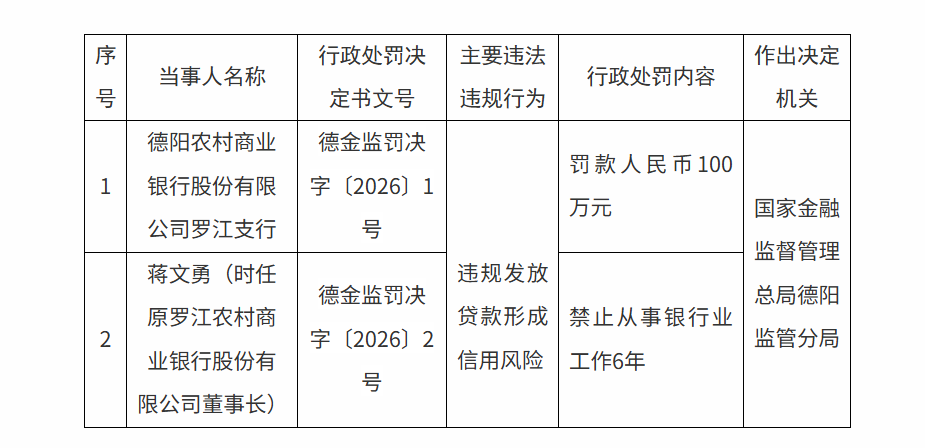 具体而言,德阳农商行罗江支行被罚款100万元,时任原罗江农村商业银行股份有限公司董事长蒋文勇被禁止从事银行业工作6年;德阳农商行中江支行罚款50万元,时任原中江县农村信用合作联社理事长邱述源被禁止从事银行业工作12年。