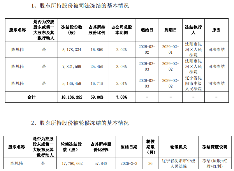 公告介绍,陈思伟本次股份被冻结和轮候冻结的具体原因是公司银行借款逾期,陈思伟为公司的授信融资提供了连带责任担保,债权人申请诉讼保全,沈阳市沈河区人民法院、辽宁省沈阳市中级人民法院冻结陈思伟上述股份。公司将持续关注该事项的后续进展情况,并按照法律法规的相关规定及时履行信息披露义务。