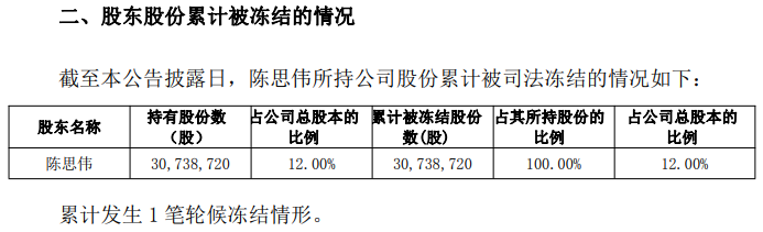 公告所附表格显示,陈思伟的股份冻结数量为1814万股,占其所持股份的59%,占公司总股本的7.08%。轮候冻结的股份数量为1778万股,占其所持股份的57.84%。截至公告披露日,陈思伟所持公司股份累计被冻结3074万股,占其持股100%,占公司总股本的12%。