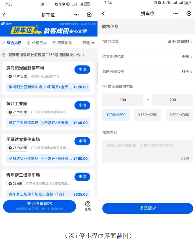 即日起,市民可通过微信搜索“深i停”小程序体验服务。平台首页将展示已上线的优惠车位信息。若未找到匹配车位,用户可直接在线登记需求。随着生态的壮大,更多定制化、惠民化的停车选择将陆续推出,让“有位可停、停得实惠” 惠及更多深圳车主。