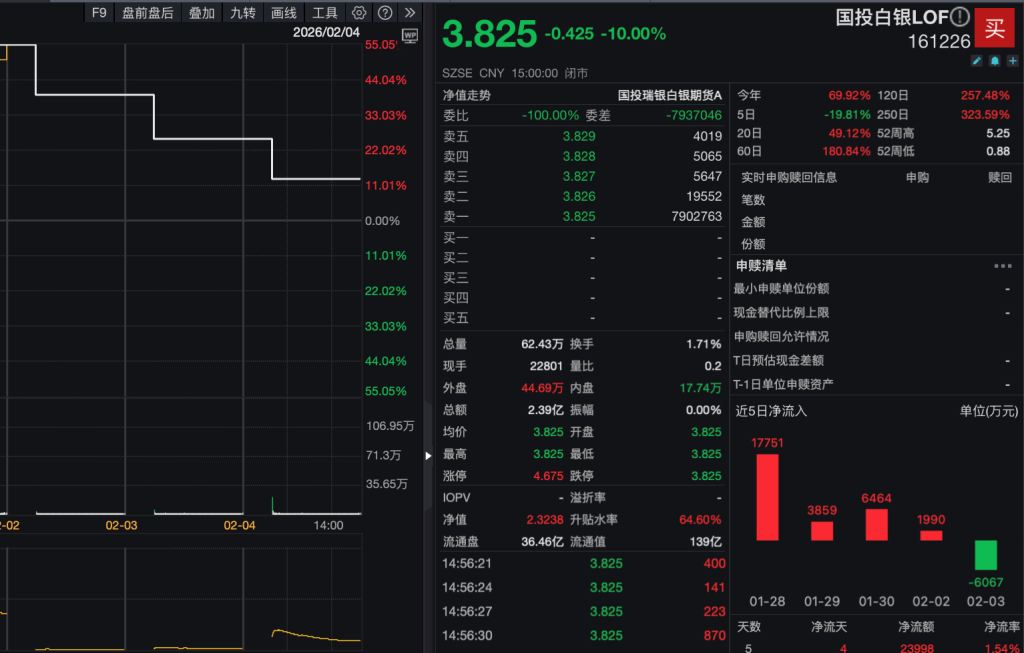 截至2月4日收盘,国投白银LOF被牢牢封于跌停板,最新价格报3.825元/份,连续三个交易日走出“一字跌停”。当日成交额攀升至2.39亿元。