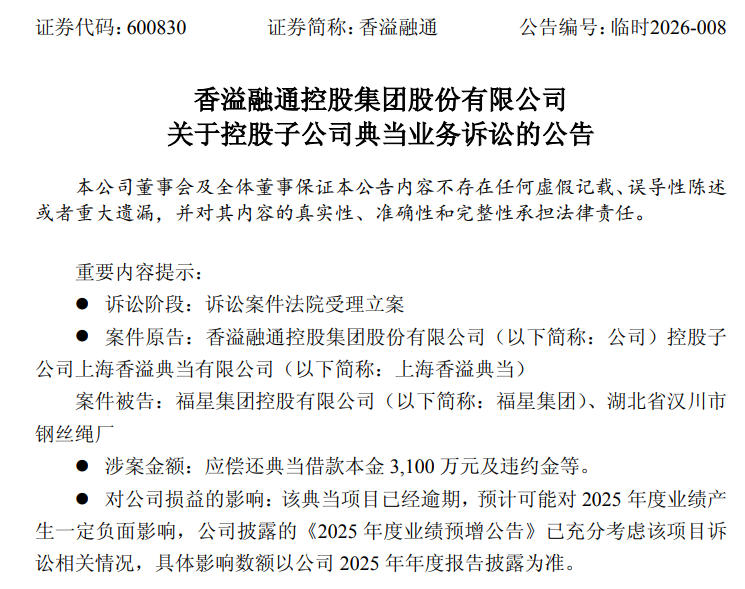 根据公告,香溢融通控股子公司上海香溢典当在1月份将福星集团等诉至上海市长宁区人民法院,要求判令福星集团偿还当金3100万元、判令福星集团支付截至2025年12月25日的违约金205.90万元和以3100万元为基数按照年利率24%计算,自2025年12月26日起至实际清偿之日的违约金。