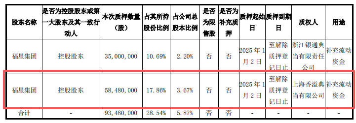 2024年12月30日,公司控股子公司上海香溢典当与福星集团签订《股票质押借款合同》,福星集团以持有的上市公司股份5848万股无限售流通股股票作为当物申请典当借款,典当借款本金5000万元,实际借款期限为自2025年1月3日起至2025年7月2日止,借款到期之日一次性归还本金,按月支付借款费用。
