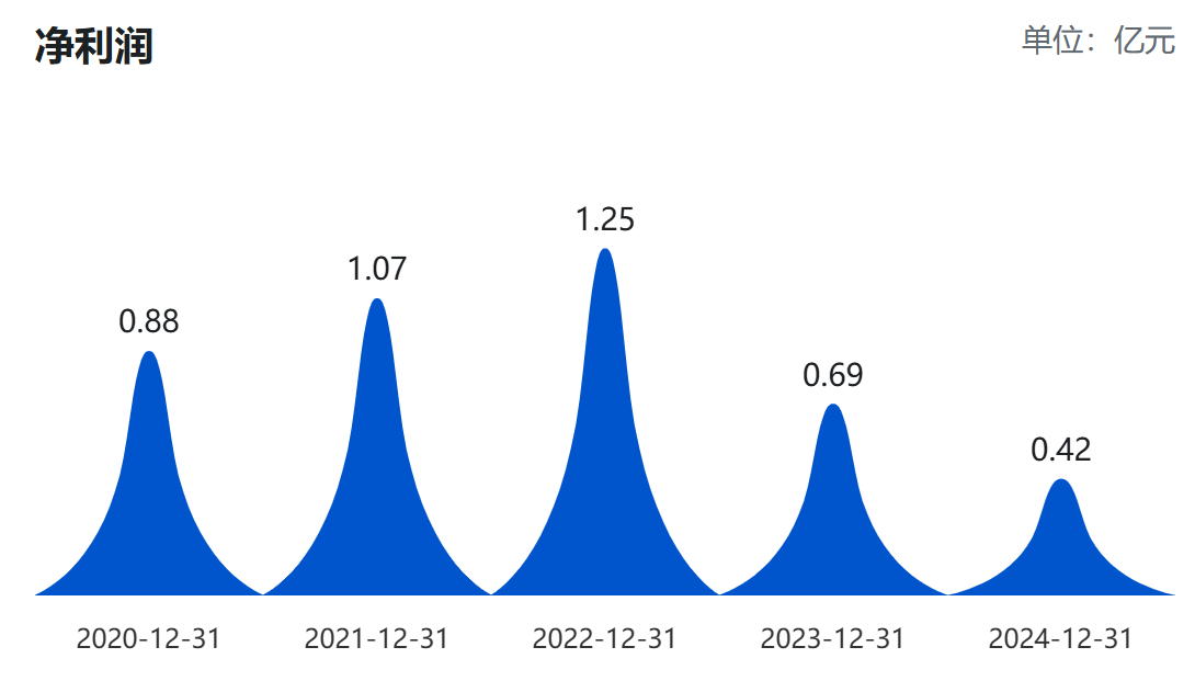 2015年至2022年,公司营业收入与净利润连续保持增长态势,但2022年上市后增速戛然而止:营业收入从2022年的21.11亿元下滑至2024年的12.82亿元,两年间缩水近四成;盈利滑坡更为显著,2022年净利润1.25亿元,2023年、2024年分别骤降44.78%、38.99%,2024年净利润仅余0.42亿元。
