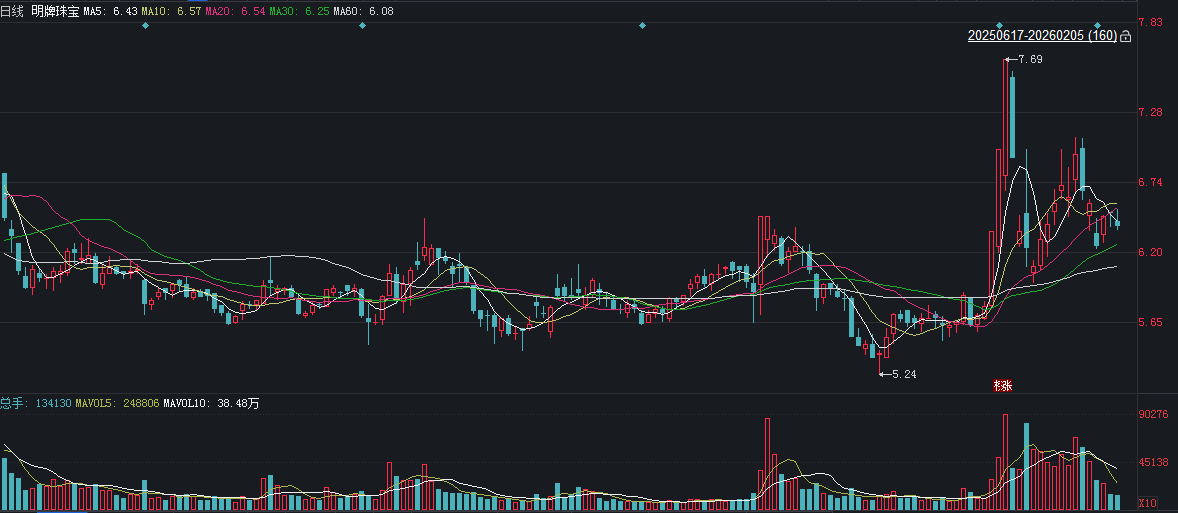 二级市场上,截至2月5日收盘,明牌珠宝下跌1.54%报6.39元/股,总市值约33.74亿元,近一年来公司股价累计上涨约四成。