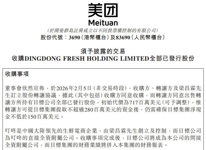 2月5日,美团在港交所公告,于2026年2月5日(非交易时段),收购方、转让方及梁昌霖订立股份转让协议,据此(其中包括)收购方同意收购,而转让方同意出售转让方所持有目标公司全部已发行股份,初始代价为7.17亿美元(可予调整),惟转让方可从目标集团提取不超过2.80亿美元的资金后,仍需确保目标集团净现金不低于1.50亿美元。
