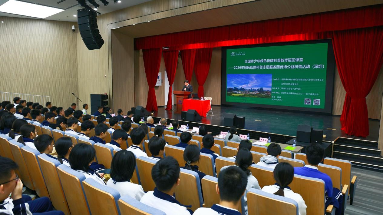 2月4日,全国青少年绿色低碳科普教育巡回课堂——2026年绿色低碳科普志愿服务团首场公益科普活动在深圳实验学校(高中园)举办。本次科普活动由中国城市科学研究会绿色建筑与节能专业委员会(简称“中国城科会绿建委”)、深圳市绿色建筑协会联合主办,深圳实验学校(高中园)承办,深圳市绿色建筑协会关心下一代工作委员会协办。