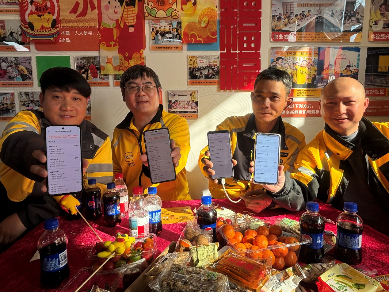 2月5日,美团骑手新春表彰活动在深圳市龙华区美团骑手党群服务中心举行。骑手们济济一堂,相聚表彰联欢,现场向骑手发放年货特产及骑手专属文创礼包,更有不少骑手晒出新年的第一笔社保补贴到账页面。