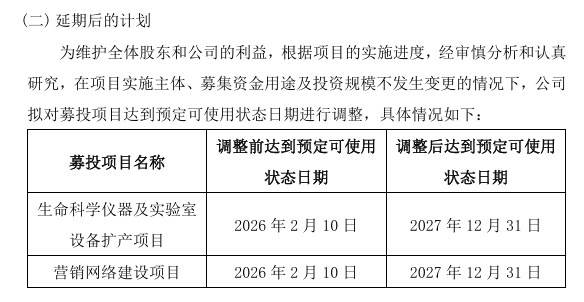 关于“生命科学仪器及实验室设备扩产项目”延期原因,公司称因本项目落位于厂房内实施,项目推进进度、实际建设周期及验收审批等各环节耗时均超出公司原有预期。该募投项目项下厂房已完成主体建筑工程的全部建设工作,各类主体结构、房屋楼栋均已施工完毕并达到完工状态。但受厂区周边市政水务管道铺设尚未完成,导致厂区消防验收尚不具备客观条件。公司正持续与市政建设相关主管部门及施工单位保持密切沟通与积极协 调,待相关配套工程完成并实现顺利接驳后,将立即启动厂房后续消防验收等各项工作,全力推进募投项目尽快达到预定可使用状态。