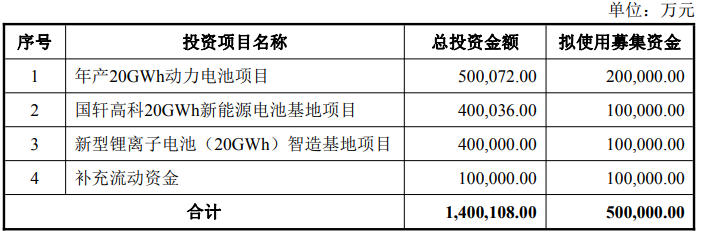 公告显示,国轩高科本次定增的募投项目包括:年产20GWh动力电池项目、国轩高科20GWh新能源电池基地项目、新型锂离子电池(20GWh)智造基地项目以及补充流动资金,相关项目总投资额超140亿元,募集资金不足部分由公司自筹解决。