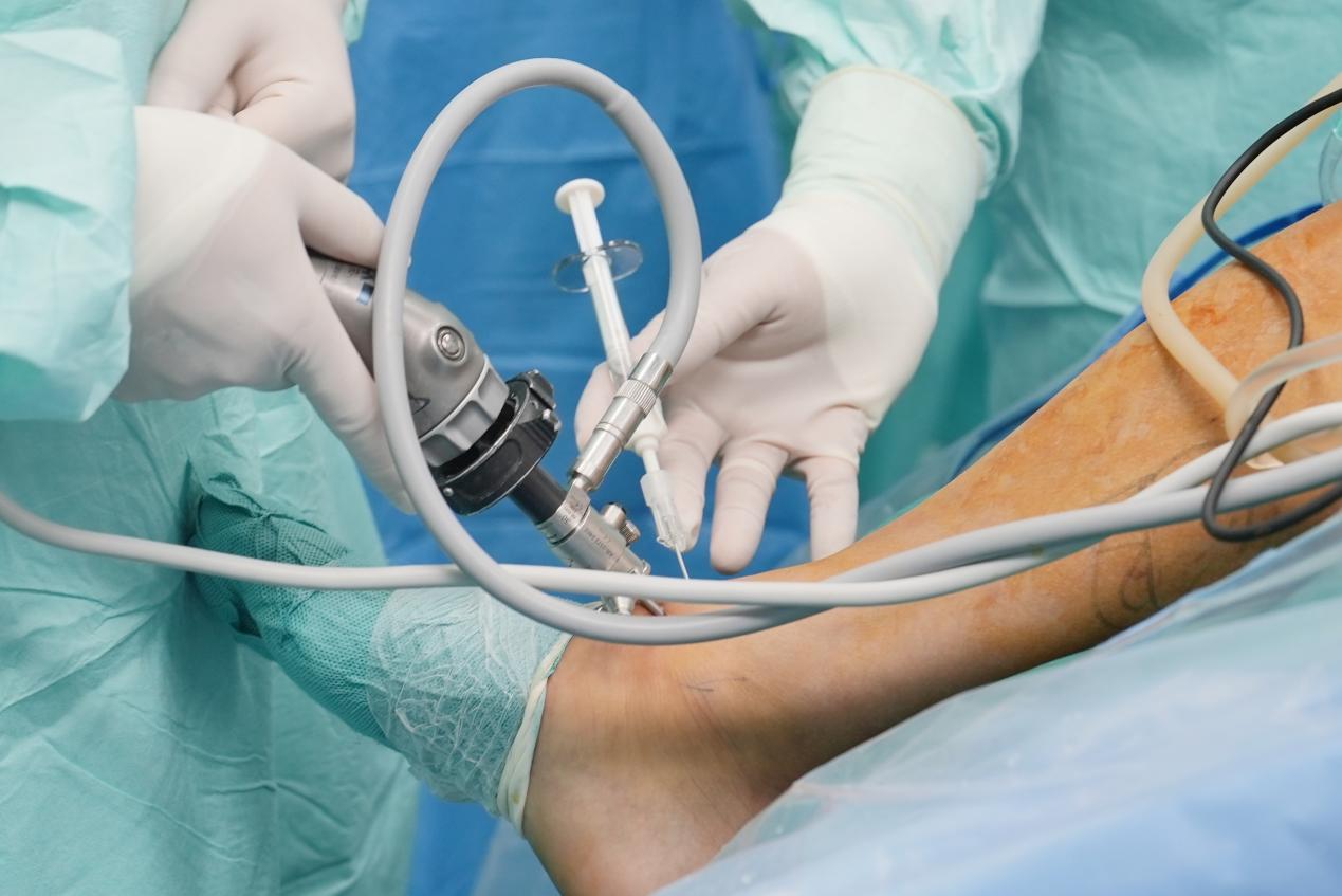 1月30日,北大深圳医院运动医学科主任张新涛与复旦大学附属华山医院运动医学科戈允申副主任医师联合主刀,共同为来自上海的姚先生(化名)实施了软骨缺损清理与CF支架植入和韧带修复手术。术中,姚先生的踝关节软骨缺损区清晰,植入的胶原蛋白材料在5分钟内即完成凝胶固化,紧密贴合缺损区域,为后续软骨再生提供良好的生物支架环境,促进软骨细胞的迁移进入。整个手术过程非常顺利,1个小时就完成了软骨和韧带的修复。当天,团队还给另外两名来自广东省外的软骨损伤患者成功实施了CF软骨修复手术。张新涛介绍,相比传统的微骨折和自体软骨移植手术,此次手术采用纯关节镜微创操作,手术切口仅需5毫米,创伤小,患者的康复速度大大加快。