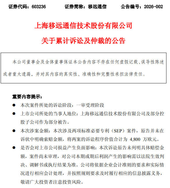 2月6日,移远通信(603236)发布公告,公司于近日收到欧洲统一专利法院海牙地方法院的程序令,因专利侵权纠纷,荷兰皇家飞利浦有限公司(简称“飞利浦”或“原告”)向法院提起诉讼,公司及部分控股子公司为部分被告。