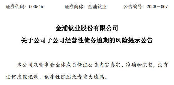 2月6日晚,金浦钛业(000545)发布风险提示公告称,子公司南京钛白化工有限责任公司、徐州钛白化工有限责任公司、安徽金浦新能源科技有限公司累计到期未付的应付账款总额约为3.92亿元,占2024年度经审计净资产28.08%,占2024年度经审计总资产13.25%。公司暂无金融债务逾期。