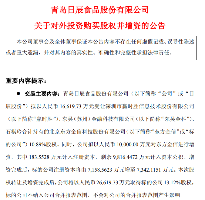 公告显示,日辰股份本次投资分为股权受让和增资两部分。公司拟以16,619.73万元受让深圳市赢时胜信息技术股份有限公司(以下简称“赢时胜”)、东吴(苏州)金融科技有限公司(以下简称“东吴金科”)、石棋玲合计持有的北京东方金信科技股份有限公司(以下简称“东方金信”或“标的公司”)10.89%股权。同时,公司拟以10,000.00万元对东方金信进行增资,其中183.5528万元计入注册资本,剩余9,816.4472万元计入资本公积。增资完成后,标的公司注册资本将由7,158.5623万元增至7,342.1151万元。本次股权转让及增资完成后,公司将以26,619.73万元取得标的公司13.12%股权,标的公司不纳入公司合并报表范围,不会对公司的合并报表范围产生影响。
