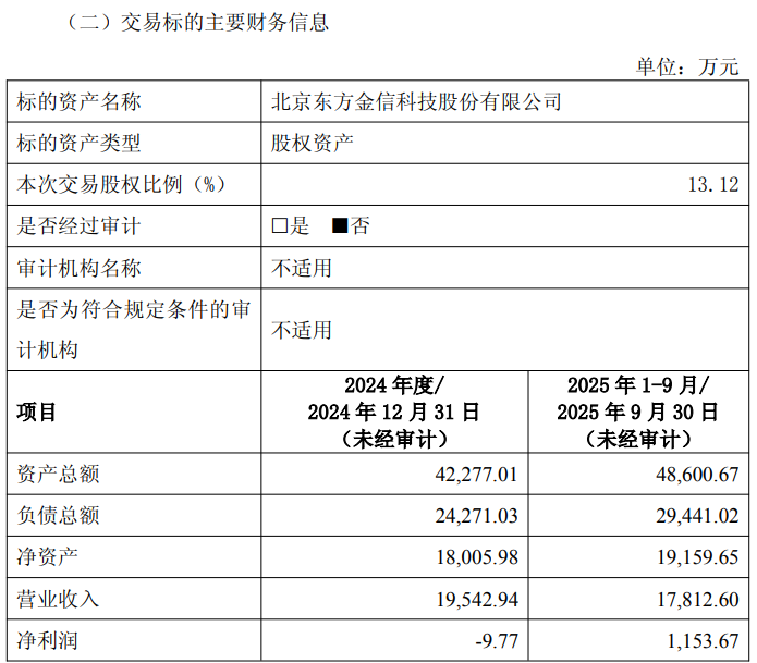 财务数据方面,根据公告披露的未经审计数据,东方金信2024年度实现营业收入1.95亿元,净利润微亏9.77万元;但其2025年前三季度业绩明显改善,实现营业收入1.78亿元,净利润1153.67万元,实现扭亏为盈。截至2025年9月30日,公司总资产4.86亿元,净资产1.92亿元。