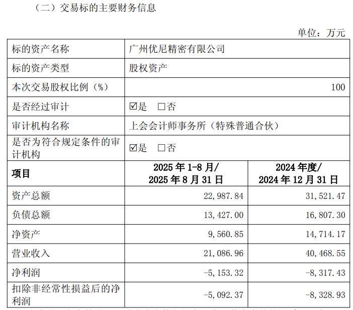 财务数据显示,优尼精密近年来经营面临一定压力,近两年持续亏损。根据上会会计师事务所(特殊普通合伙)审计的财务数据,2024年度,优尼精密实现营业收入4.05亿元,净利润为-8317.43万元,扣除非经常性损益后的净利润为-8328.93万元;2025年1-8月,公司实现营业收入2.11亿元,净利润为-5153.32万元,扣非净利润为-5092.37万元。截至2025年8月31日,标的公司资产总额2.3亿元,负债总额1.34亿元,净资产9560.85万元。