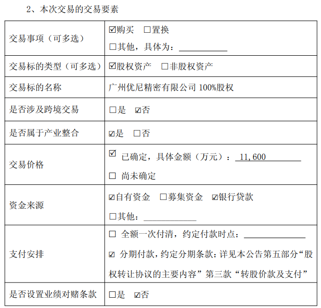 公告称,本次交易不构成关联交易,不构成重大资产重组。相关程序方面,公司于2026年2月6日召开第四届董事会第三次会议,审议通过了《关于收购广州优尼精密有限公司全部股权的议案》。本次交易已达到股东会审议标准,尚需提交股东会审议。