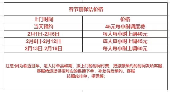 “价格变化快得让人措手不及。” 陈女士告诉记者,她从 2025 年12月就开始关注节前大扫除服务,起初只是在日常价格基础上每单加几十元,耽误了几天后,发现加价幅度很快升级为每小时加30元,最近更是涨到每小时40元。“不同平台定价规则不一样,有的按服务时长加价,有的按房屋面积核算,一套100平方米左右的房子,三四个小时的日常清洁服务(非深度保洁),价格在300元-400元,比平时贵了一倍还多。” 陈女士介绍。