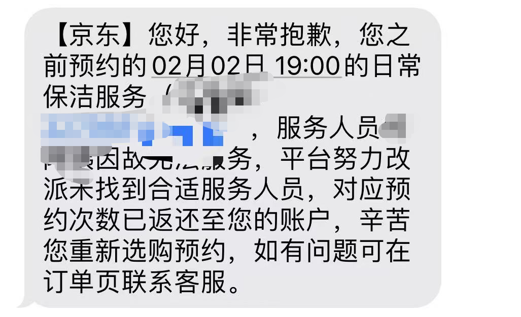 犹豫的赶不上趟,手快的也可能被爽约。张女士下单相对果断,早早在京东家政支付了49元春节服务费,成功预约了2月2日两小时的保洁服务。然而就在服务前一天,她突然收到平台短信,称预约的阿姨因故无法服务,平台虽尝试改派却未能找到合适人员,订单被迫取消,建议她重新预约。当张女士再次打开预约页面时,价格已进一步上涨。
