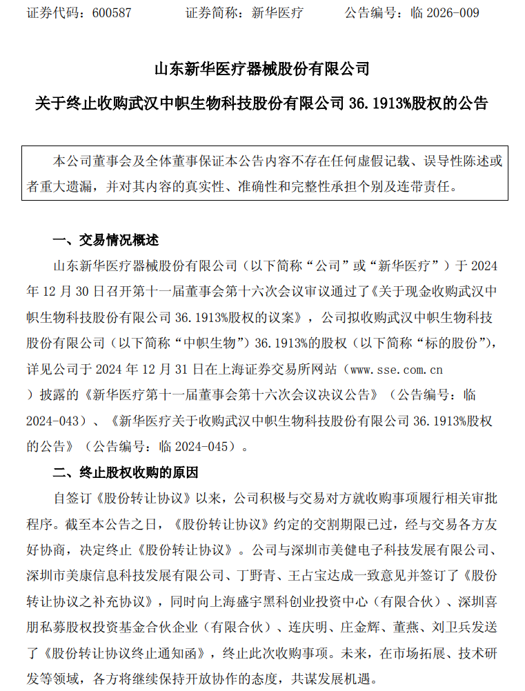 新华医疗(600587)同日公告,将终止收购武汉中帜生物科技股份有限公司(下称“中帜生物”)36.1913%股权。