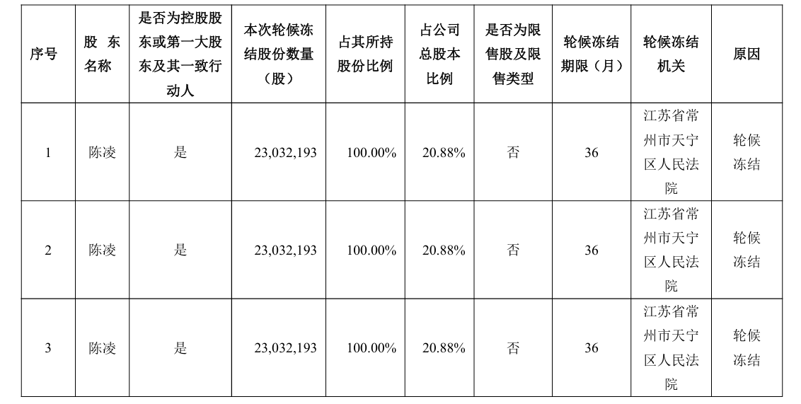据天禄科技(301045)2月6日公告,该公司近日收到控股股东、实际控制人之一陈凌先生的通知,并通过中国证券登记结算有限责任公司系统查询,获悉陈凌所持2303.22万股公司股份被轮候冻结,占其所持股份比例的100%,占公司总股本比例为20.88%。
