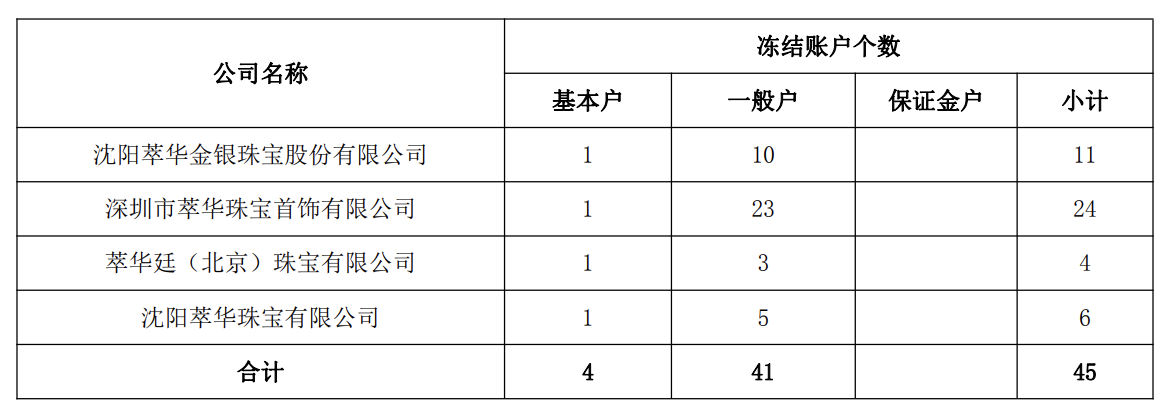 公告显示,截至2026年2月6日,萃华珠宝及子公司由于合同纠纷和借款逾期导致公司主要银行账户被冻结,被冻结银行账户45个。(其中:基本户4个、一般户41个)实际冻结累计金额为人民币472万元。