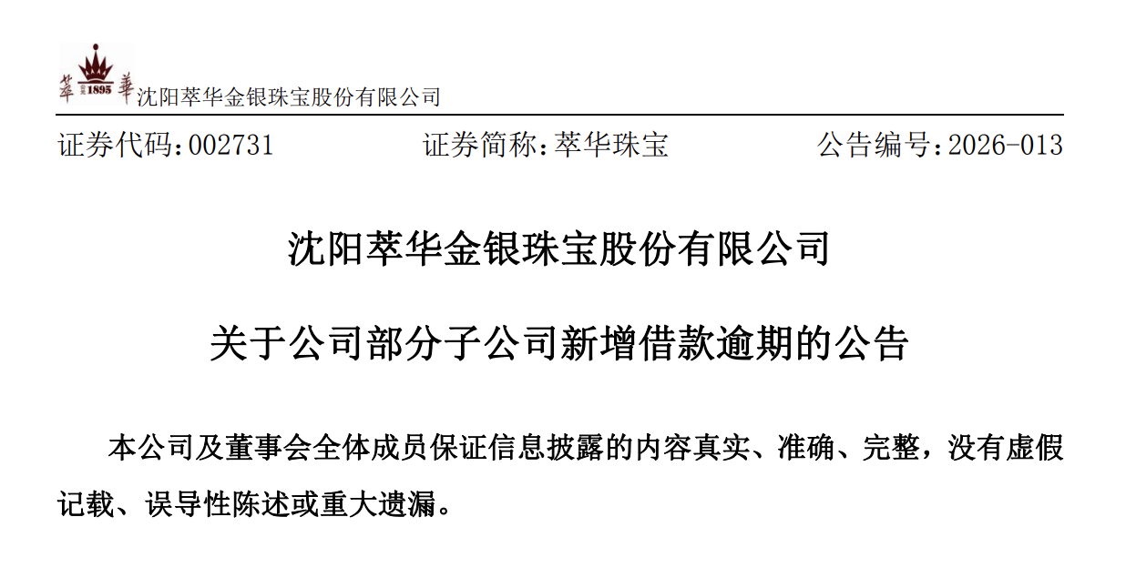 萃华珠宝表示,因上述借款逾期,公司及子公司可能会承担相应的违约金、滞纳金和罚息等费用。若上述借款逾期问题未能得到妥善解决,公司及子公司可能面临诉讼、仲裁、被要求履行连带担保责任等风险,公司控股股东、部分5%以上股东也可能面临诉讼、仲裁、被要求履行连带担保责任等风险。借款逾期事项可能会导致公司及子公司融资能力下降,进一步加剧公司财务风险。同时公司存在部分银行借款将于2026年2月到期,公司也正在积极沟通借款展期事宜。