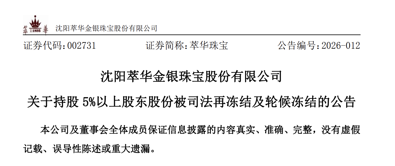 此外,2月6日晚间萃华珠宝还发布关于持股5%以上股东股份被司法再冻结及轮候冻结的公告。