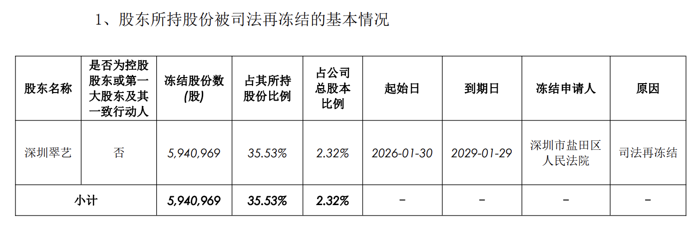 深圳翠艺5,940,969股被司法再冻结,占公司总股本比例2.32%,冻结时间自2026年1月30日起至2029年1月29日止。