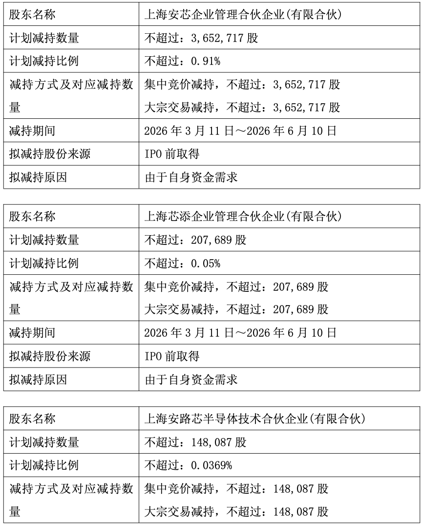 由于自身资金需求,安芯合伙将根据市场情况拟通过集中竞价或大宗交易方式减持其所持有的公司股份不超过3,652,717股,拟减持股份数量占公司总股本的比例合计不超过0.91%;安路芯合伙将根据市场情况拟通过集中竞价或大宗交易方式减持其所持有的公司股份不超过148,087股,拟减持股份数量占公司总股本的比例合计不超过0.0369%;芯添合伙将根据市场情况拟通过集中竞价或大宗交易方式减持其所持有的公司股份合计不超过207,689股,拟减持股份数量占公司总股本的比例合计不超过0.05%。