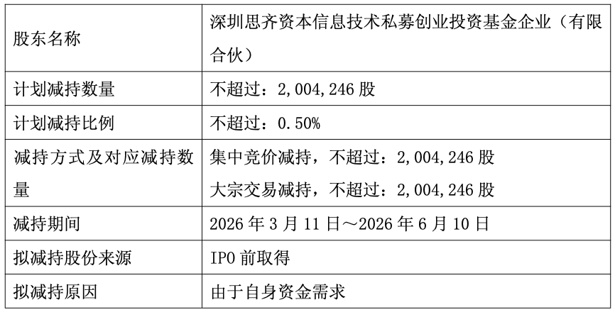 股东深圳思齐持有公司股份25,000,972股,占公司总股本的6.24%。上述股份来源于公司首次公开发行前持有的股份,并于2022年11月14日起上市流通。由于自身资金需求,深圳思齐将根据市场情况拟通过集中竞价或大宗交易方式减持其所持有的公司股份合计不超过2,004,246股,拟减持股份数量占公司总股本的比例合计不超过0.50%。
