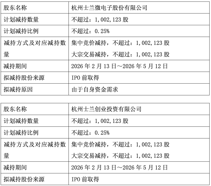 由于自身资金需求,士兰微将根据市场情况拟通过集中竞价或大宗交易方式减持其所持有的公司股份合计不超过1,002,123股,拟减持股份数量占公司总股本的比例合计不超过0.25%;士兰创投将根据市场情况拟通过集中竞价或大宗交易方式减持其所持有的公司股份合计不超过1,002,123股,拟减持股份数量占公司总股本的比例合计不超过0.25%。