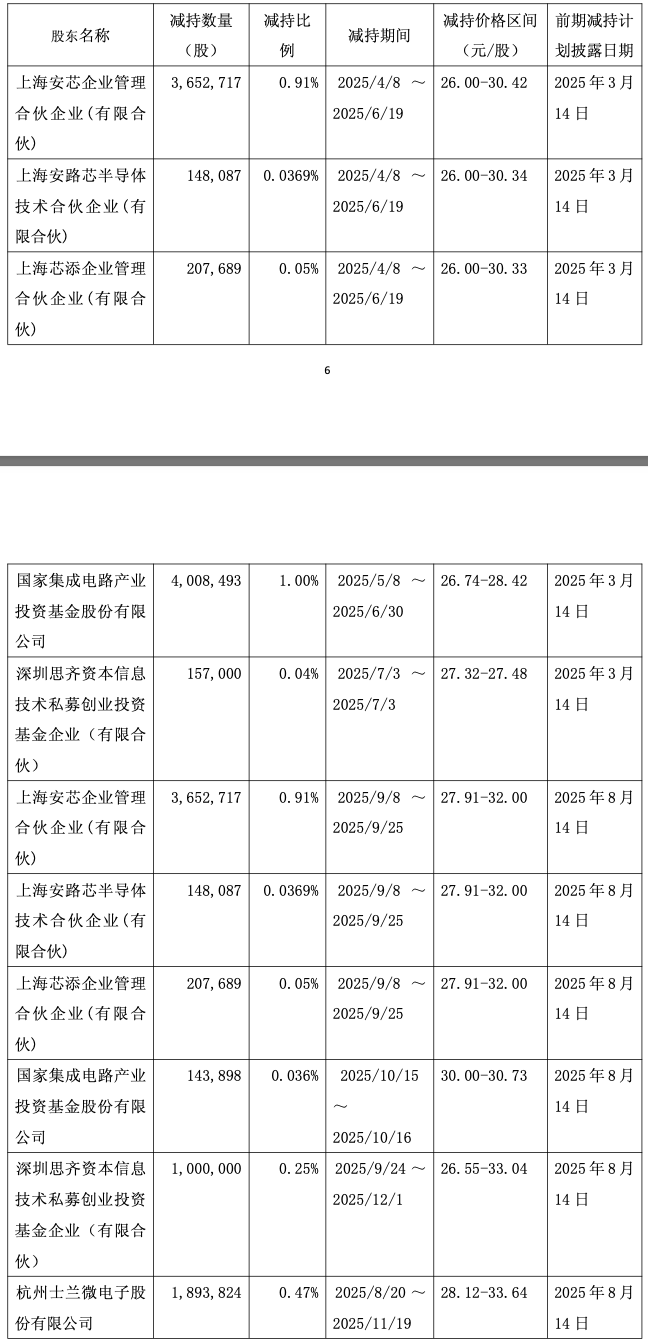 2月8日,安路科技(688107)公告,公司于近日收到股东安芯合伙、安路芯合伙、芯添合伙、产业基金、深圳思齐、士兰微、士兰创投分别出具的关于股份减持计划的告知函。