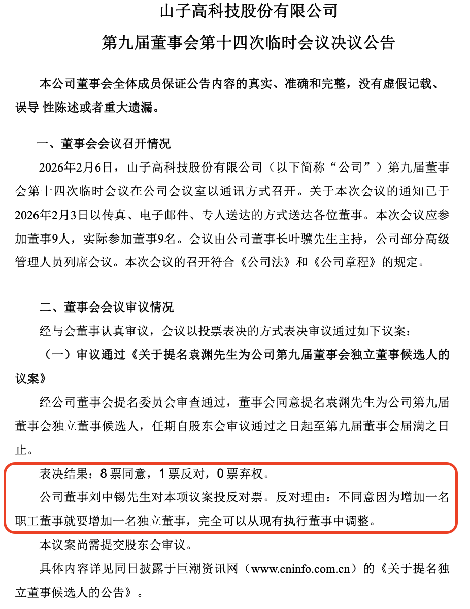 2月8日,山子高科(000981)披露第九届董事会第十四次临时会议决议公告,在五项议案中,一项关于独立董事提名的决议出现了罕见的反对票,董事刘中锡公开质疑公司“因增加职工董事而配套增加独立董事”,为这场人事调整增添了戏剧性色彩。