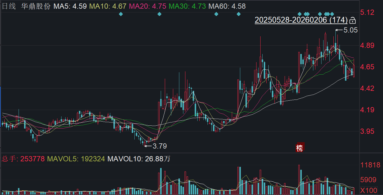二级市场上,截至2月6日收盘,华鼎股份上涨2.41%报4.67元/股,总市值约51.56亿元,近一年来公司股价累计上涨约16%。
