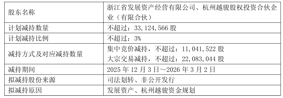1月7日,公司收到发展资产及杭州越骏发来的《简式权益变动报告书》。本次权益变动前,发展资产及杭州越骏合计持有公司股份比例5.72%;本次权益变动后,合计持有公司股份比例4.9999%。权益变动同时触及5%刻度,本次减持计划尚未实施完毕。