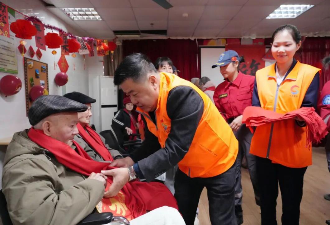 志愿者为长者戴上温暖的红围巾
