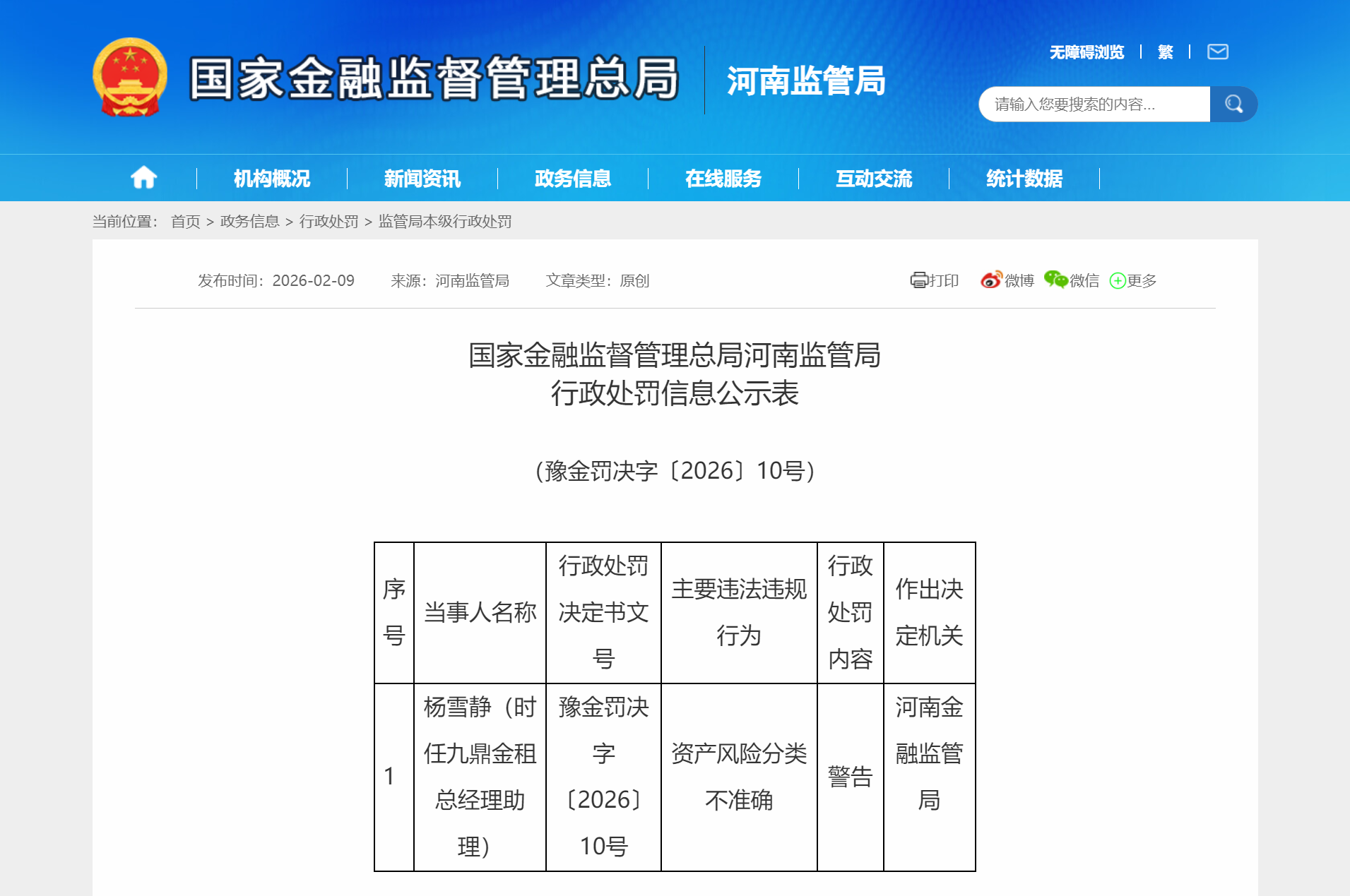 国家金融监督管理总局河南监管局官网2026年2月9日发布的行政处罚信息公示表显示,因资产风险分类不准确,杨雪静(时任九鼎金租总经理助理)受到警告。