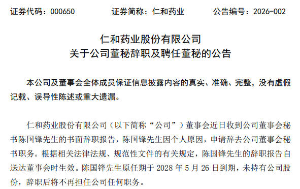 2月9日,仁和药业(000650)发布公告,公司董事会近日收到公司董事会秘书陈国锋的书面辞职报告,陈国锋因个人原因,申请辞去公司董事会秘书职务。