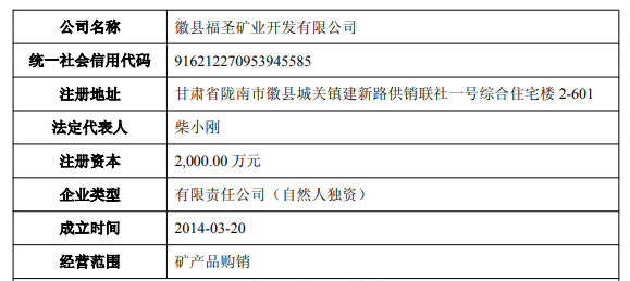 公告披露,福圣矿业拥有1宗采矿权,矿权名称为徽县福圣矿业开发有限公司徽县老圣沟金矿,开采矿种为金矿,生产规模为5万吨/年,矿区面积1.2022平方公里,有效期至2035年4月20日。