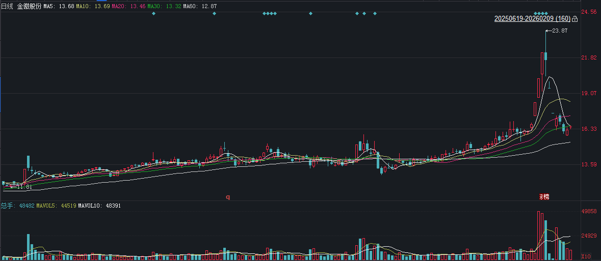 二级市场上,截至2月9日收盘,金徽股份上涨1.60%报16.46元/股,总市值约160.98亿元,近一年来公司股价累计上涨近五成。