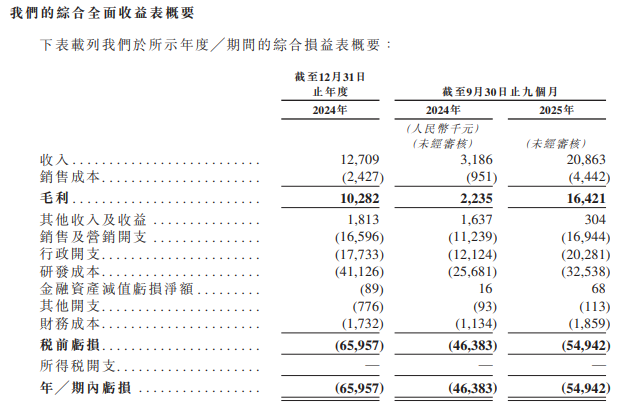 公司自成立以来一直处于净亏损状况,并预期在可预见未来将继续维持净亏损。2024年以及截至2024年及2025年9月30日止九个月,公司产生的净亏损分别为人民币66百万元、人民币46.4百万元及人民币54.9百万元。公司的业务处于研发驱动及早期商业化阶段,需要在产品开发、临床试验、监管申报及市场推广活动方面进行大量及持续投资。