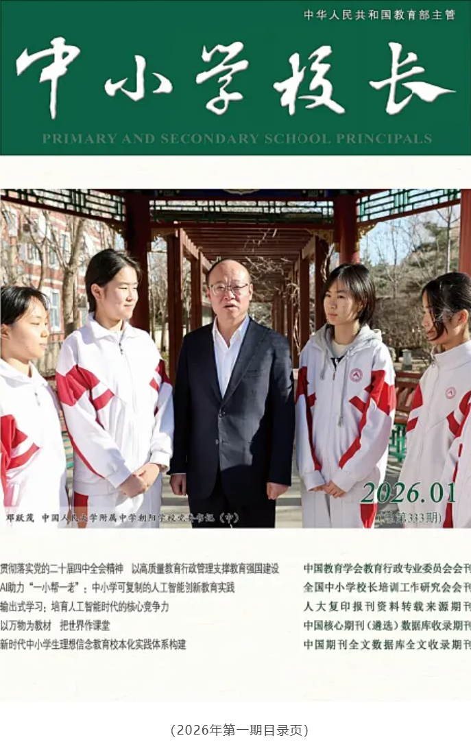 近日,由深圳理工大学附属实验高级中学(中科附高)党总支书记宋如郊主笔的《在科学家身边成长——拔尖创新人才全链条培养体系的创新探索》一文,作为该校科学教育的核心成果,正式刊发于国家级核心期刊《中小学校长》2026年第1期。