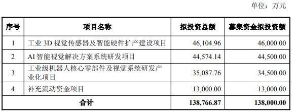 具体来看,工业3D视觉传感器及智能硬件扩产建设项目为本次募投的重点项目之一,总投资金额为4.61亿元,拟使用募集资金投入金额为4.6亿元。
