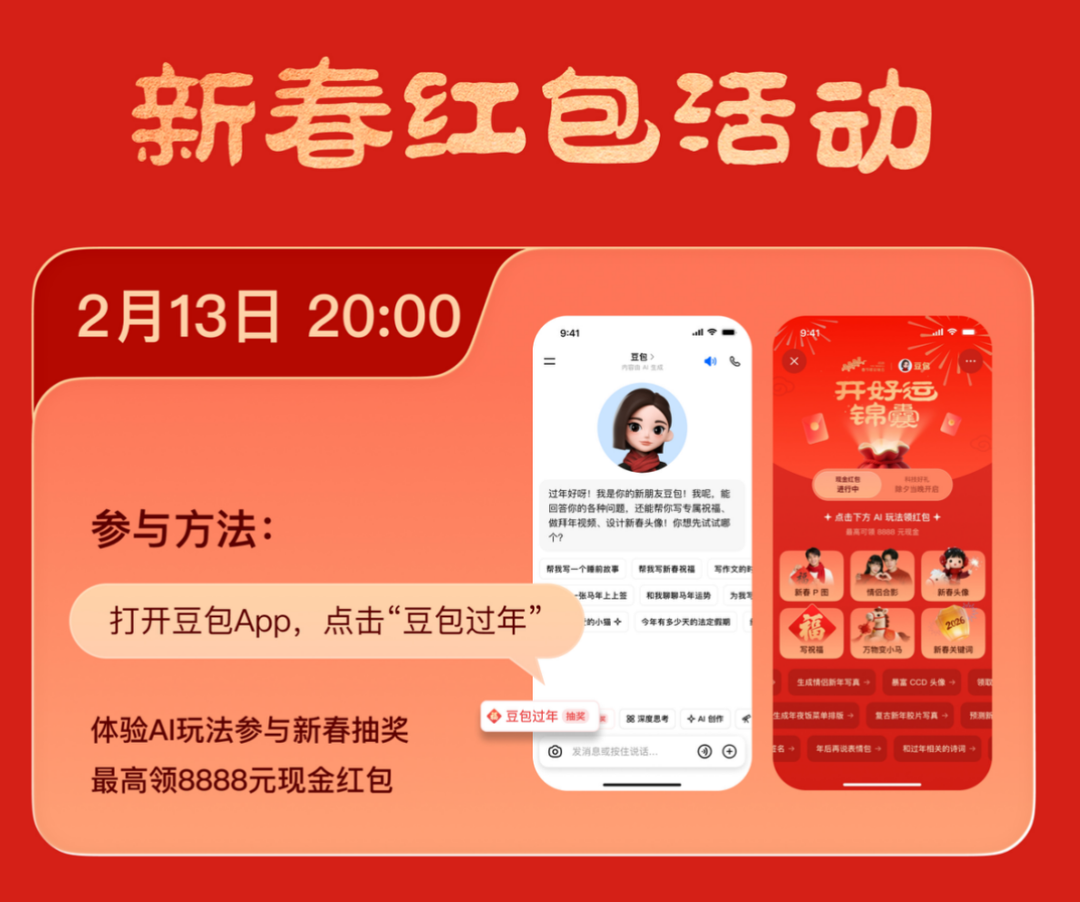 2月16日除夕夜,豆包将在中央广播电视总台春晚期间,配合直播互动,开启第二阶段红包及科技礼包抽奖。当晚,用户将有三轮机会赢取最高8888元的现金红包或接入豆包大模型的智能科技好礼。
