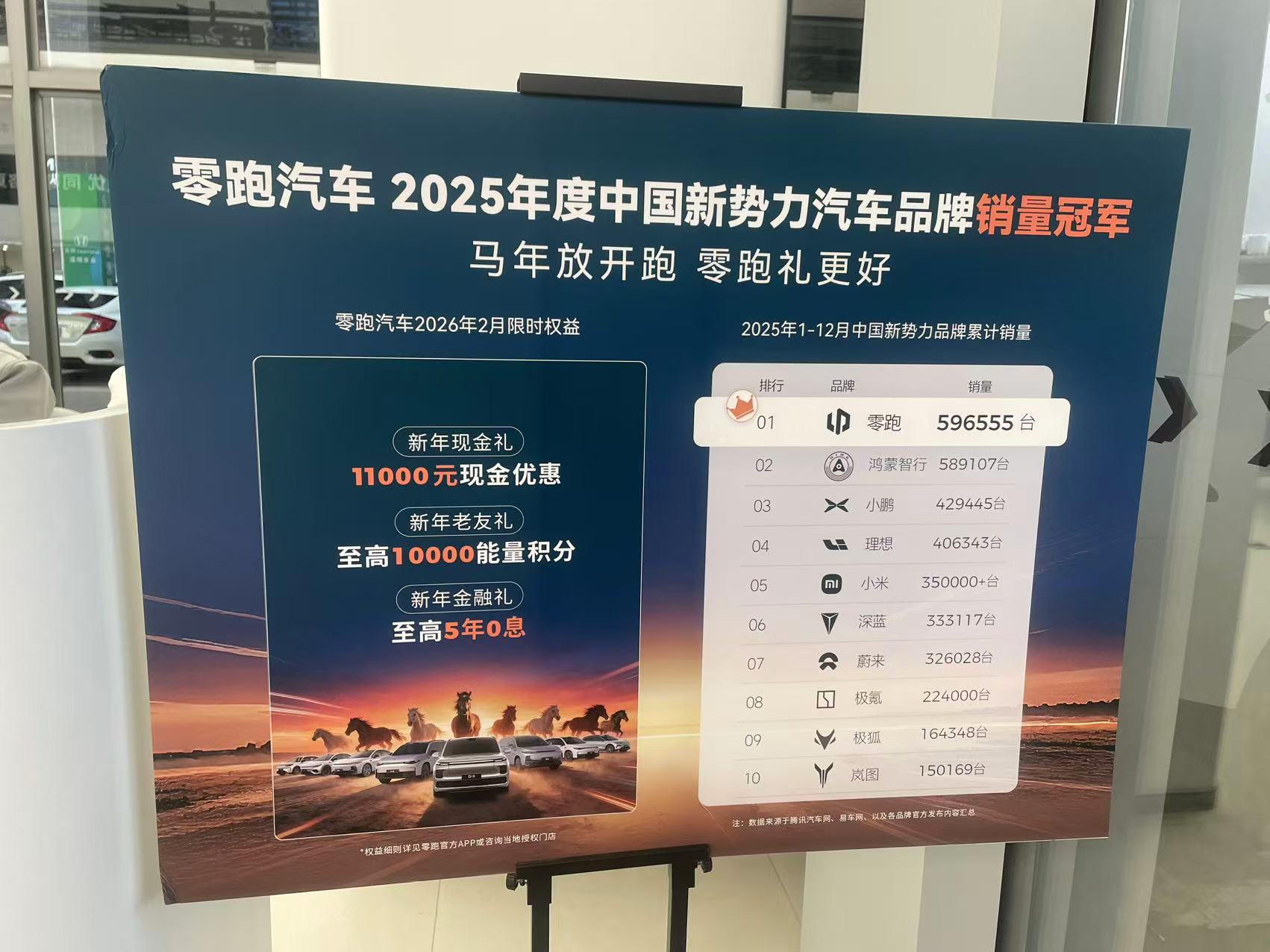 目前,在深圳,10万元以下新能源车赛道已非常拥挤。比如比亚迪王朝系列的“元”,售价降至7.48万元。此外,2025年度中国新势力汽车品牌“销售冠军”零跑汽车,零跑Lafa5车型售价97800元,春节期间推出1.1万元的现金优惠。销售人员告诉记者:“我们主打性价比,所以去年蝉联中国新势力品牌销量第一,去年销量近60万台。”