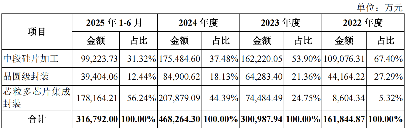 公司主营业务收入中,芯粒多芯片集成封装业务占比从2022年的5.32%飙升至2025年上半年的56.24%,而传统的中段硅片加工业务占比则从67.40%下滑至31.32%。