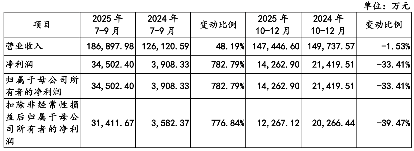 2025年第三季度,公司净利润同比暴增782.79%至3.45亿元,但第四季度却同比骤降33.41%至1.43亿元。
