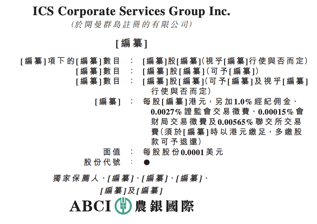 据港交所2月10日披露,ICS Corporate Services Group Inc.(简称:ICS集团)向港交所主板递交上市申请书,农银国际为其独家保荐人。