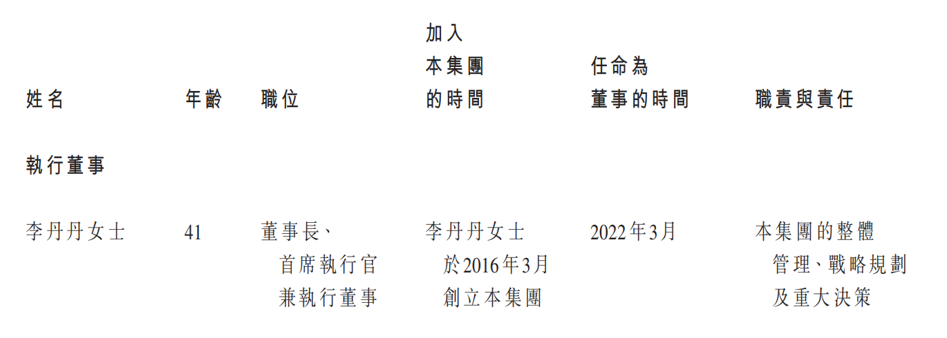 根据招股书披露,李丹丹现年41岁,为集团创始人、董事长、首席执行官及执行董事之一。